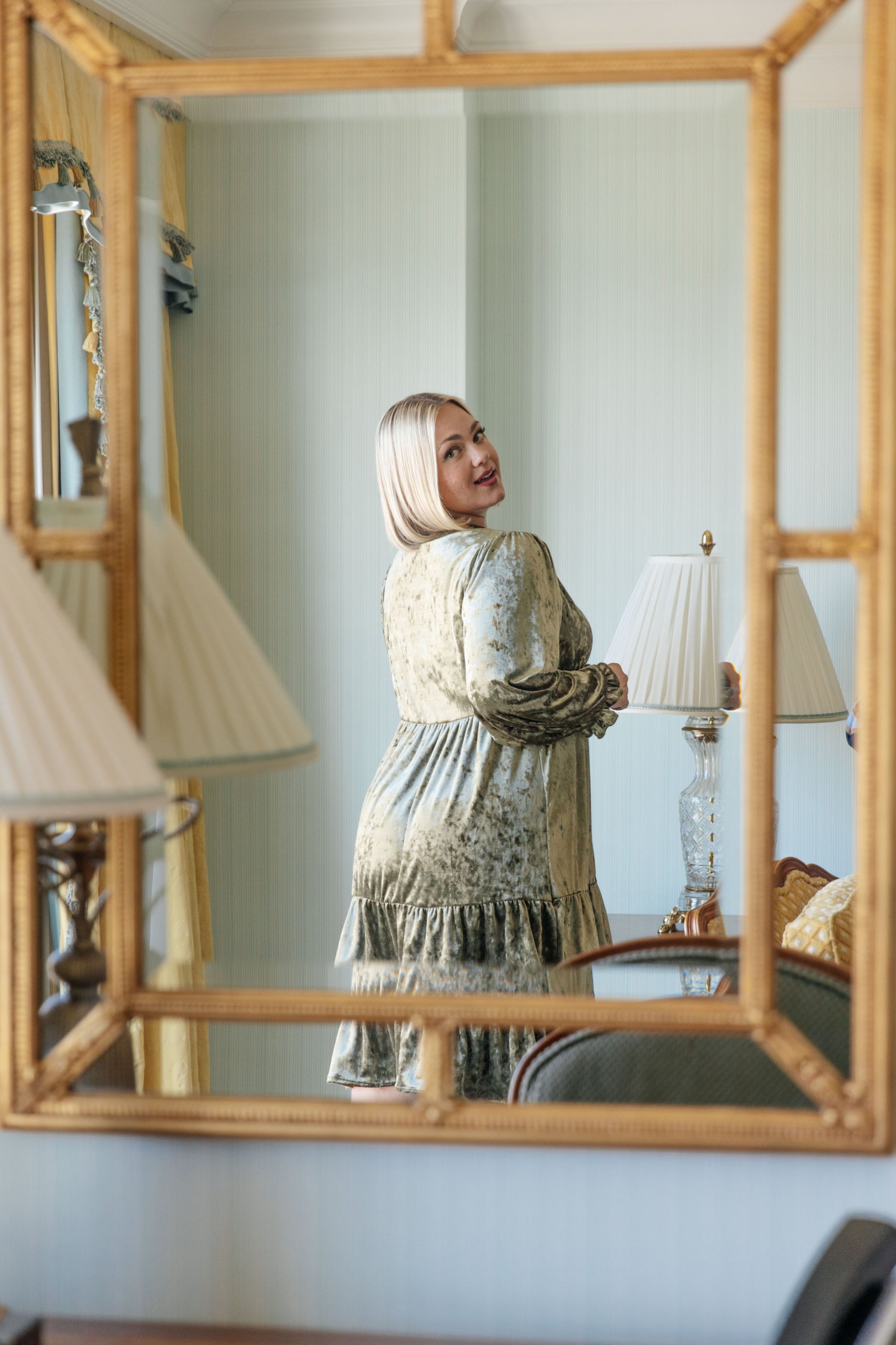 This Velvet Verve V-Neck Dress will make you stand out in any evening. It features a crushed velvet fabric, long sleeves with gathered cuffs, a deep V-neck, and a ruffled hem. The luxurious design will add a touch of elegance to any ensemble.